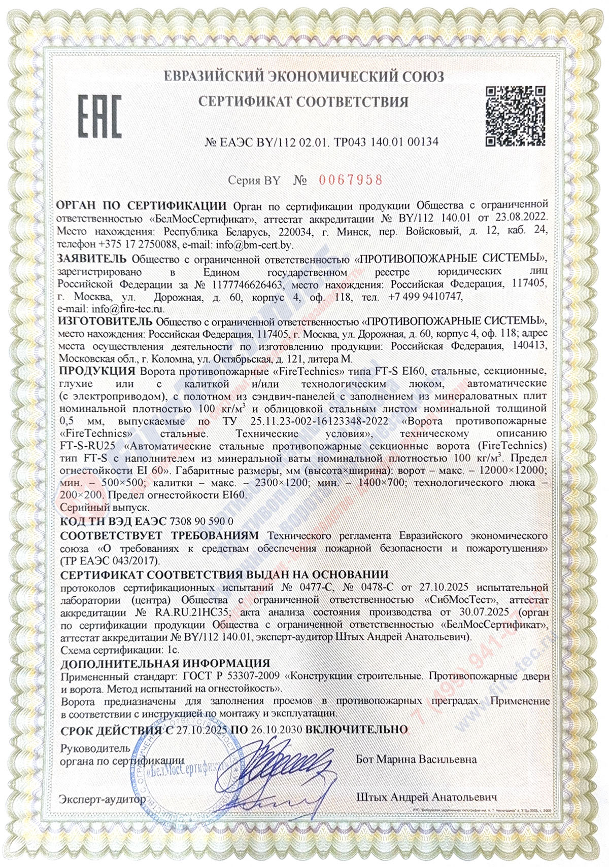 В соответствии с решением Совета Евразийской экономической комиссии от 23 июня 2017 года № 40, изделия типа противопожарных штор подлежат обязательному подтверждению соответствия требованиям Технического регламента ЕАЭС 043/2017 «О требованиях к средствам обеспечения пожарной безопасности и пожаротушения».